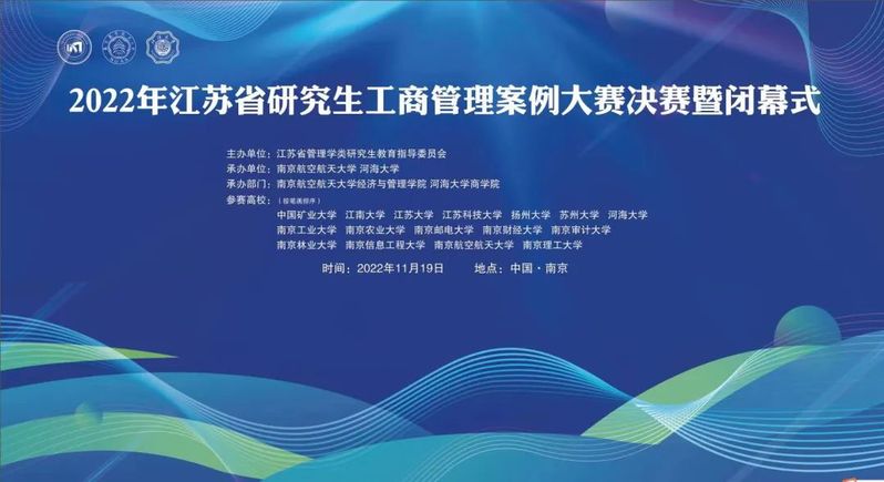 11月19日,由江苏省管理学类研究生教育指导委员会主办,南京航空航天大学与河海大学共同承办的2022年江苏省研究生工商管理案例大赛决赛圆满谢幕。本次决赛共有24支队伍进行角逐,通过抽签两两对决的形式进行线上答辩。最终,我院参赛队取得了二等奖的好成绩,同时,也获得了最佳组织奖的荣誉称号。