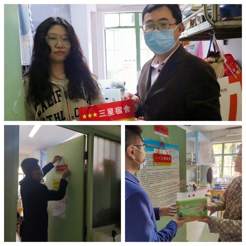 11月17日-18日,由各辅导员带队、学生代表参与的评比小组根据学校迎校庆学生宿舍卫生大扫除检查标准和我院学生星级宿舍评比实施办法对全体学生宿舍进行集中检查评比,在提醒各学生宿舍做好冬季宿舍卫生整理、文明生活的同时,还开展安全检查教育工作,提醒各学生宿舍要严格遵守学校关于违章电器的有关规定,坚决杜绝违章电器在冬季易发、多发的情况。11月23日,学院党委副书记、副院长郭强带领有关辅导员前往三星宿舍挂牌、发放奖品并查看宿舍情况,他向连续获评三星宿舍的宿舍成员表示充分肯定、对于新获评三星宿舍的宿舍成员表示鼓励,希望全体三星宿舍能够珍惜荣誉,带动更多同学将宿舍营造成温馨的学习、生活环境。