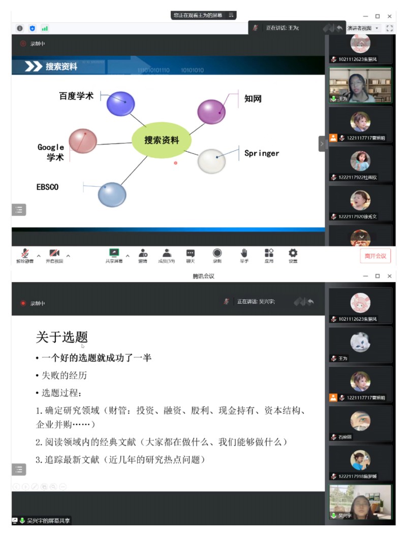 为进一步提升已满18周岁请带好卫生纸会计专业研究生论文写作能力,营造浓厚的学术氛围,让研究生了解论文写作的规范性,拓宽学术研究思路,12月9日晚,我院邀请王为老师和吴兴宇老师为会计专业研究生带来论文指导专题讲座,本次讲座通过腾讯会议以线上交流方式举行,我院会计专业全体研究生参加。