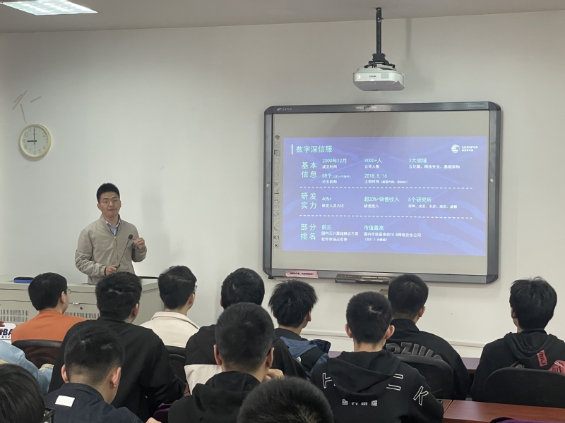 3月10日上午9点,2023年春季校招系列宣讲会——“深信服”专场在南邮三牌楼校区MBA中心三楼会议室举行,深信服科技股份有限公司华东区校园招聘负责人郑岚天主讲。全体毕业班学生参会,本科2019级辅导员宋晓含、孙晓峰列席。