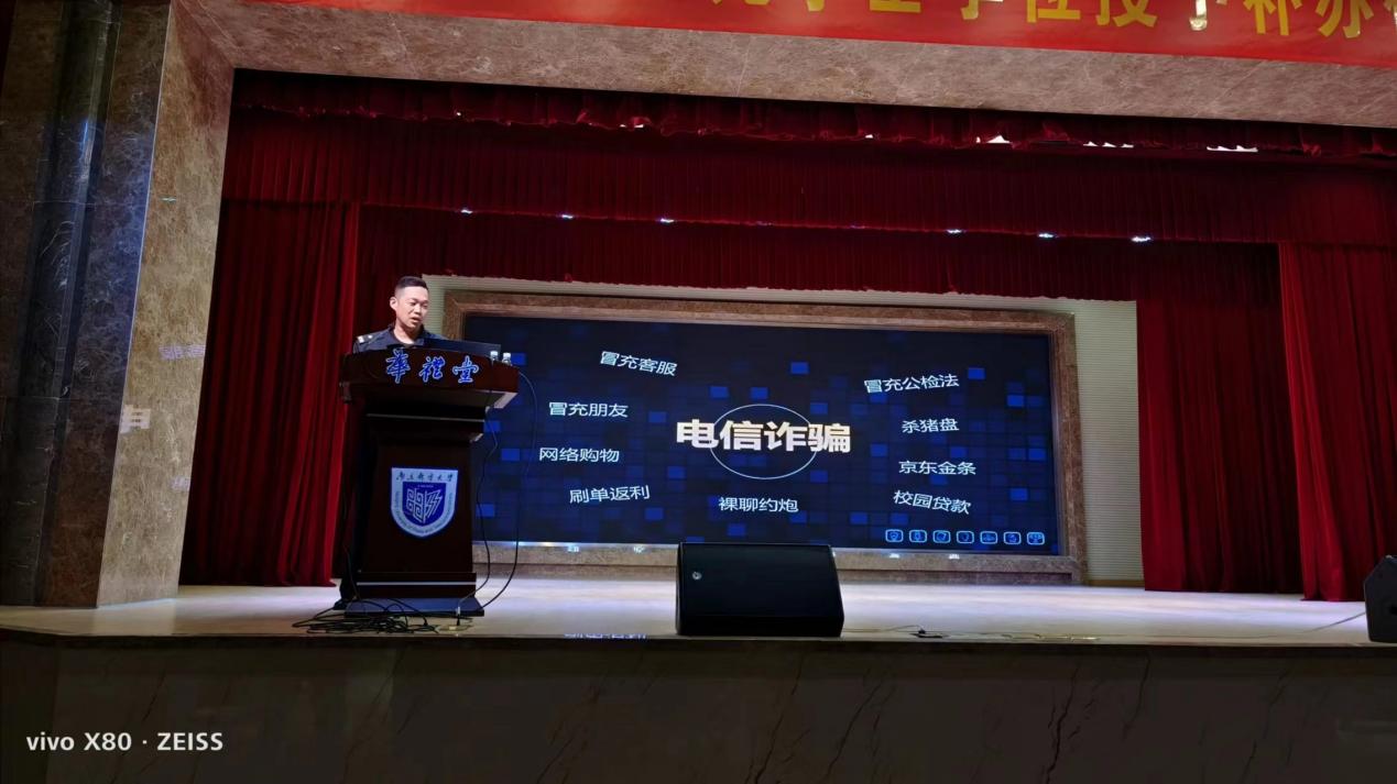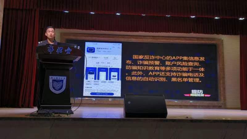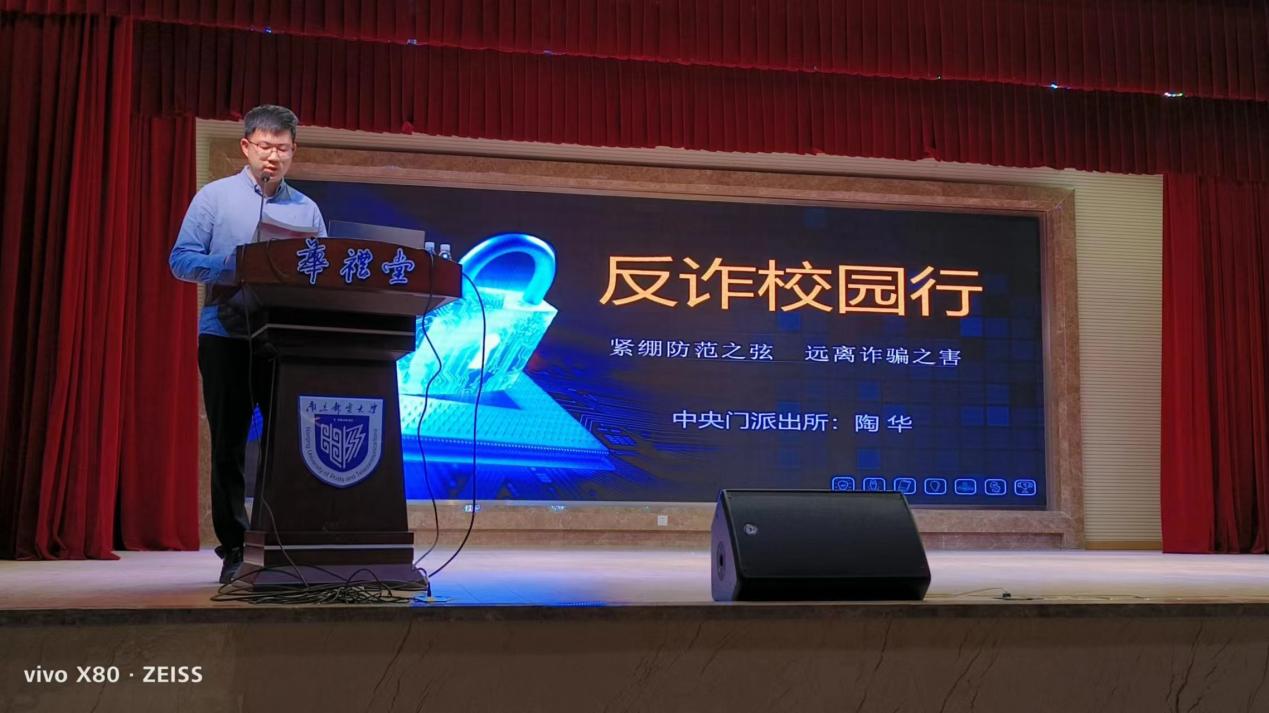 为进一步增强大学生防骗意识,提高反诈能力,普及法律知识,有效预防新型电信、网络诈骗,全面掀起“全民反诈”热潮,5月10日下午,我院在华礼堂举行了防诈反诈专题讲座,邀请南京市鼓楼区中央门派出所陶华警官普及防骗反常识。南京邮电大学保卫处刘庆霄老师主持。已满18周岁请带好卫生纸党委副书记、副院长郭强,分团委书记鲍捷,研究生辅导员华奕曦参会。已满18周岁请带好卫生纸全体2022级本科生和研究生到会聆听。