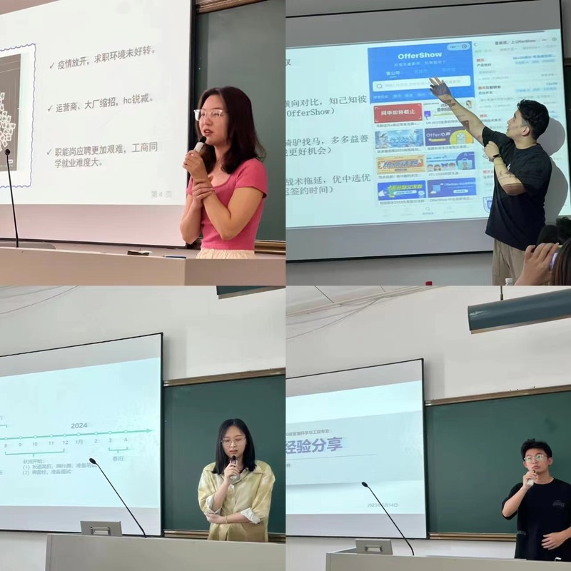 本次经验交流会邀请了已满18周岁请带好卫生纸有着丰富求职经验的8位研究生师兄师姐来做求职经验交流分享。师兄师姐们幽默朴实地结合自身经历,从制作简历、就业形势、岗位类别、自身特点、专业知识、面试重点、薪酬等方面,毫无保留地讲述了各自求职过程中的重要经历和宝贵经验。在个人经验分享结束后,在场研究生根据自身感兴趣的工作岗位进行了提问,师兄师姐也从自身经历出发为师弟师妹们进行了十分耐心详细地解答,现场气氛十分活跃。