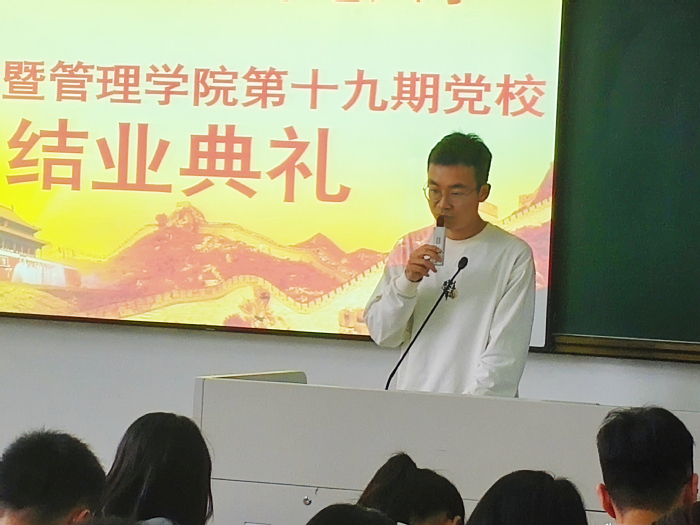 典礼在《国际歌》中拉开序幕,郭强副书记给优秀学员颁发奖状,鼓励学员们继续努力,不断创新。学员代表杨凯翔同学在发言中回顾本期培训的重点内容并分享自己在培训期间的心得体会,他表示将不断加强对政治理论知识的学习,提高自己的思想觉悟,加强自身的修养,用党的优良传统和作风教育自己,把共产党人全心全意为人民服务的宗旨意识融入到自己的学习和生活中去,积极向党组织靠拢,用实际行动争取早日加入中国共产党。