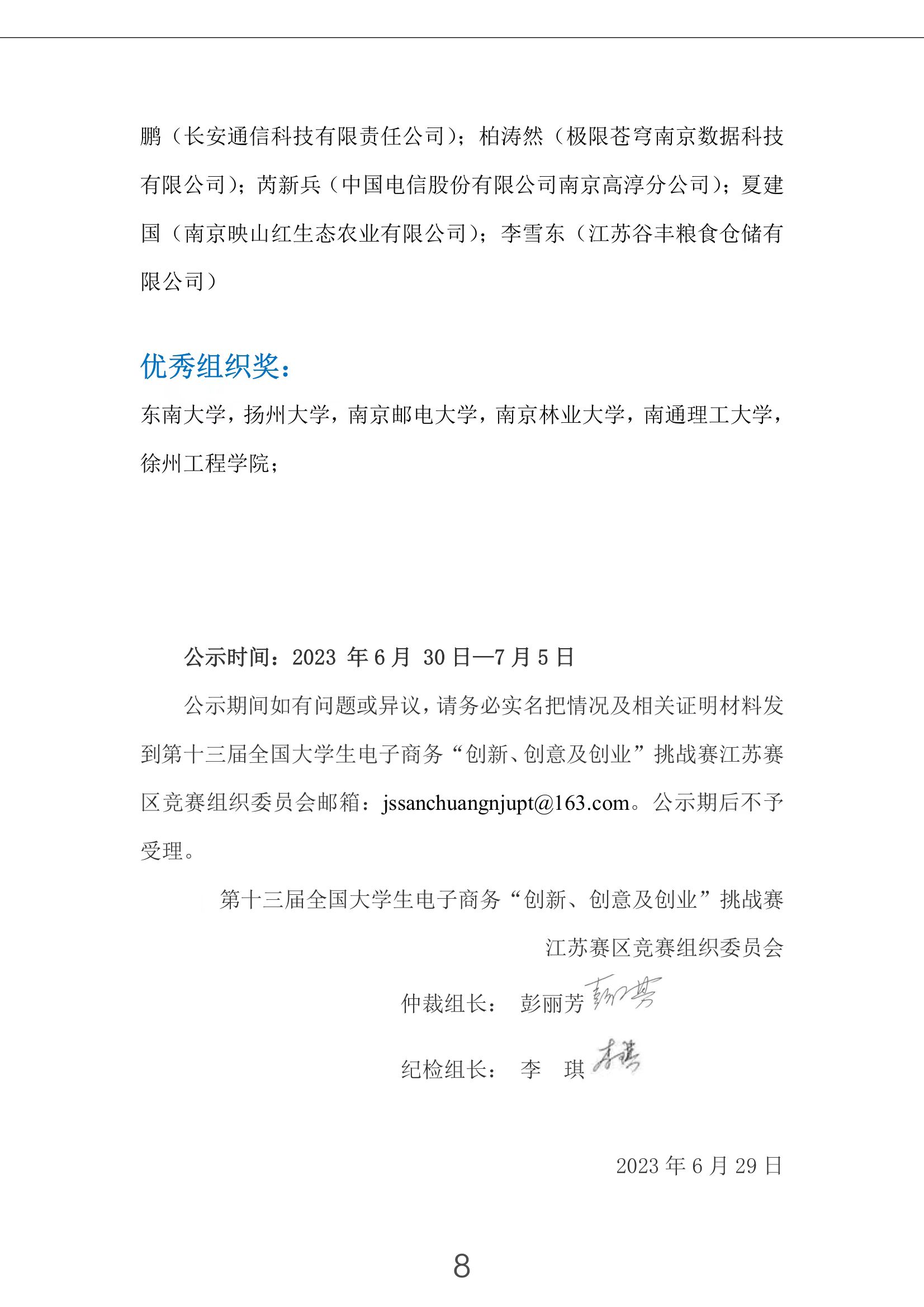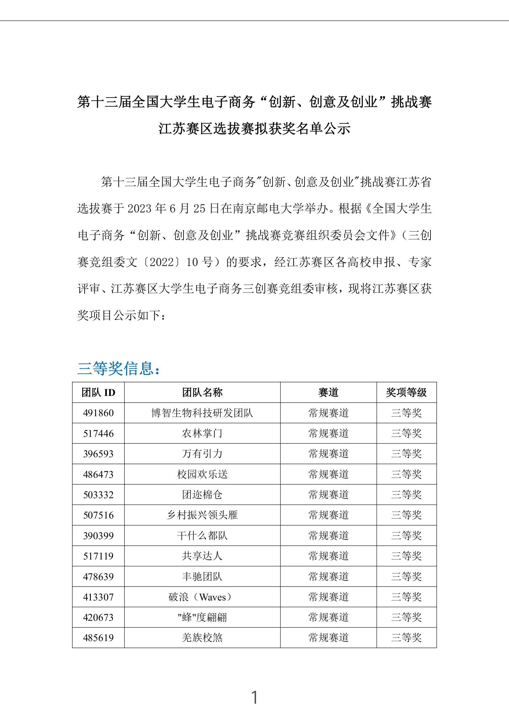 公示-第十三届全国大学生电子商务“创新、创意及创业”挑战赛江苏赛区选拔赛拟获奖名单