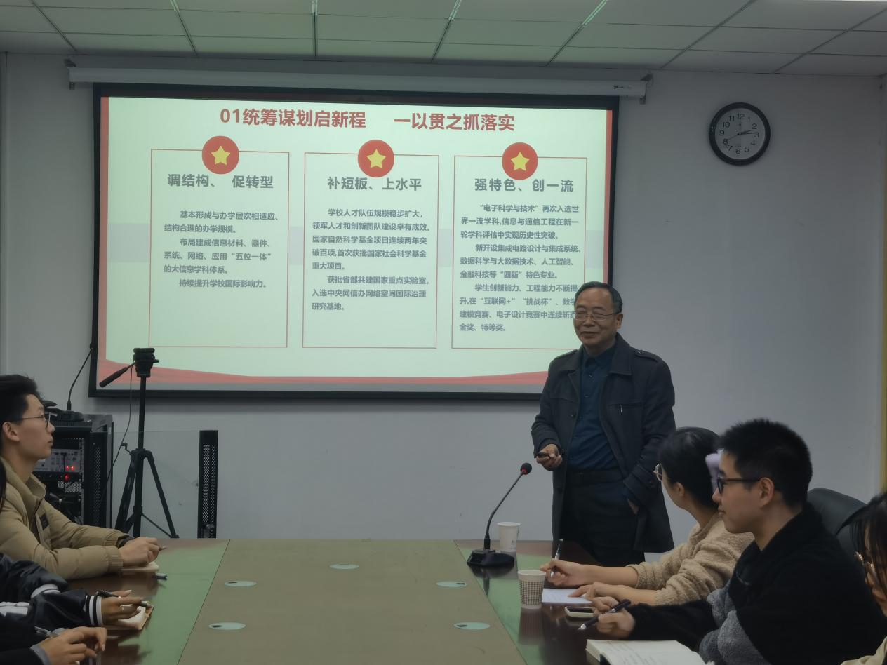 会上,卢教授指出,此次党代会是学校全面贯彻落实党的二十大精神,加快学校国家“双一流”和江苏高水平大学建设关键时期召开的一次十分重要的会议。他围绕“锚定一流 踔厉奋发 加快向研究型大学迈进 为建设电子信息领域特色鲜明的世界一流大学而奋斗”会议主题,依次带领学生进行四个篇章深入学习:一是,第三次党代会以来的工作回顾;二是,学校事业发展面临的形势与奋斗目标;三是,今后五年事业发展的专项行动;四是,坚持和加强党对学校工作的全面领导。在老师领学、学生互学中,同学们进一步明晰了学校实现高质量发展的宏伟目标和奋进方向,激发了奋斗热情和担当意识。