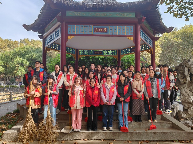 梧桐飘零,志愿者们迎着初冬的暖阳,开始认真地清扫。在篮球场上、眼镜湖周、行政楼旁,处处可见身着红马甲的身影。他们拿着簸箕、扫帚等各式清扫工具,以热情积极的态度将校园打扫的干净整洁。
