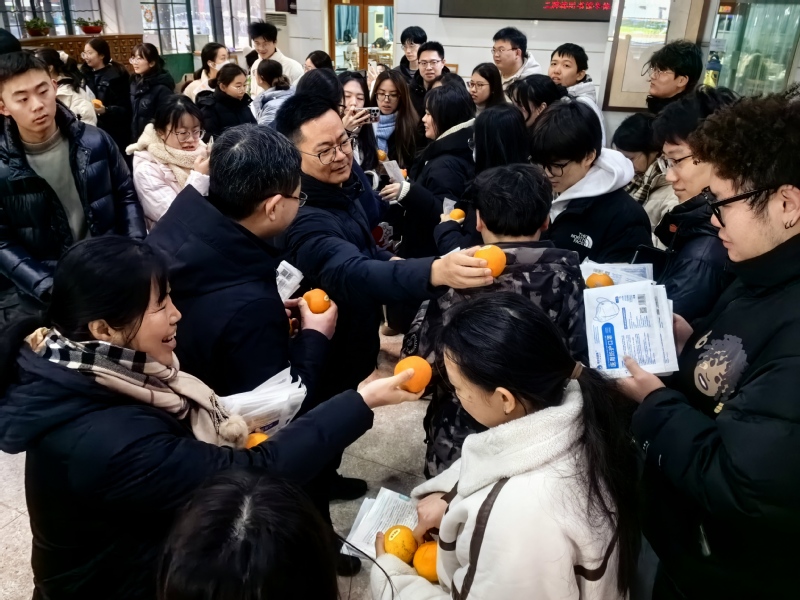 在图书馆大厅,钟书记一行详细了解2024届考研学生的复习情况,充分肯定大家近一年的辛苦与付出,希望全体同学能够坚持初心、沉稳答题、稳定发挥,为自己的拼搏和努力交出一份满意的答卷。钟书记一行还为在场同学发放橙子等慰问品,祝愿全体同学心想事“橙”、一战“橙”硕、“橙”胜追击。慰问活动后,钟书记详细了解了2024届考研送考安排等情况,要求2024届毕业班辅导员精心组织、周密谋划,为考生营造舒适、温馨的送考环境,帮助考生顺利、平安到达仙林校区。