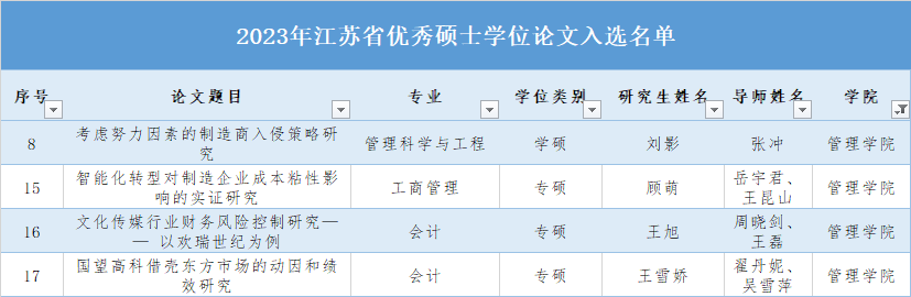 近日,江苏省学位委员会、江苏省教育厅公布2023年江苏省优秀博士硕士学位论文评选结果。经培养单位初评推荐、省研究生教育指导委员会论文复评、省评估院综合专家组评议、省学位办专家委员会审议、网上公示等环节,我院获评省优秀学术学位硕士学位论文1篇、省优秀专业学位硕士学位论文3篇。