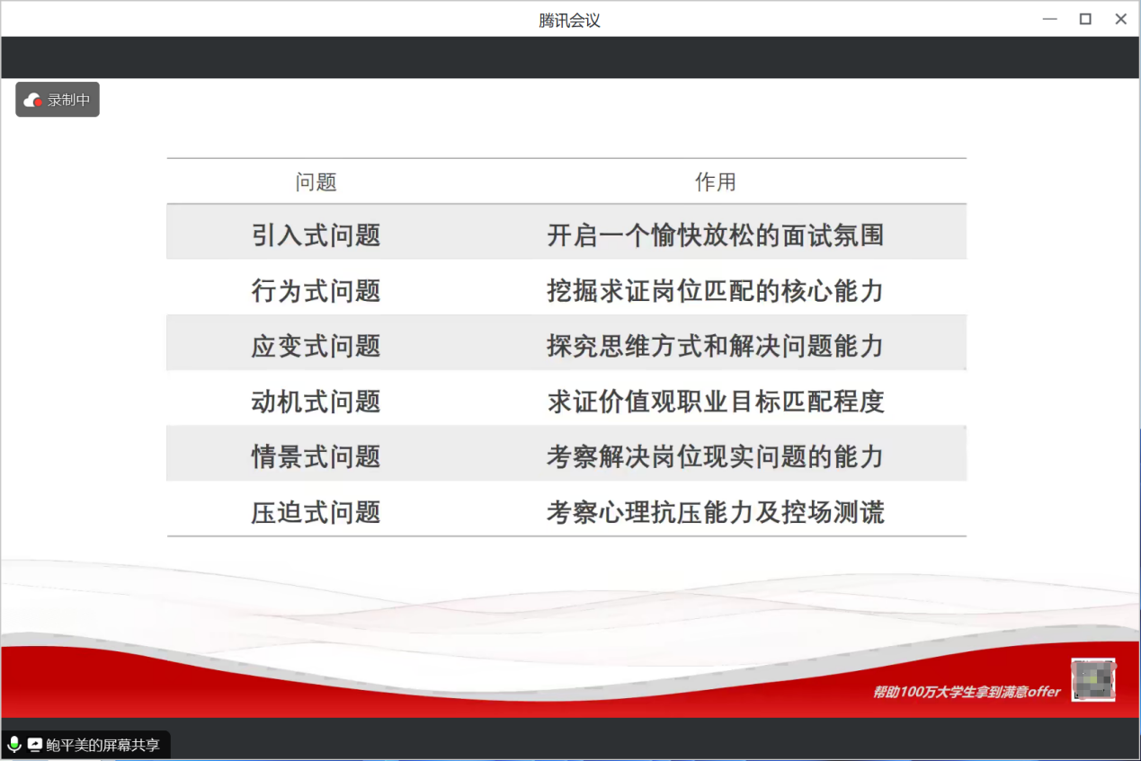 鲍老师首先分析了春招和秋招的异同点,带领学生更好了解春招的时间节点、岗位特点、招聘要求等内容。随后针对常见的面试形式,鲍老师做了深入浅出的剖析,针对常见的面试问题,鲍老师也进行了分析和示范性解答。在总结阶段,鲍老师表示面试是企业深入了解应聘人员的重要途径,因此希望参加招聘活动的各位同学在面试中要沉着冷静、答中要点,在面试中展示出自己的风采和水平。最后开凯老师做总结,希望全体同学能以自己或身边同学的面试经历为参考,分析自己的优缺点,在面试前做好准备,提高自己春招面试的成功率,为自己争取心仪的offer。