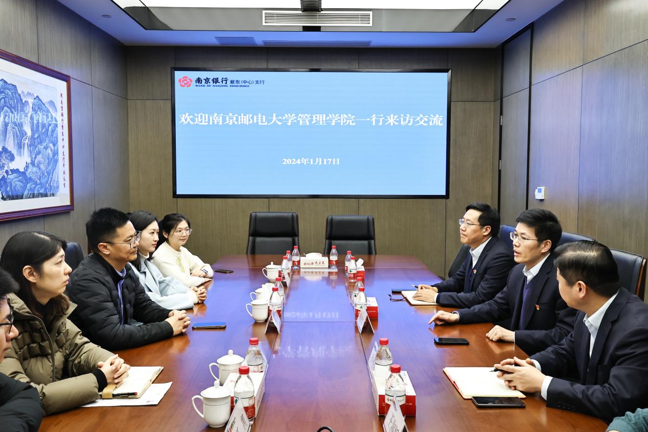 为贯彻落实学校第四次党代会精神和毕业生就业工作的决策部署,扎实做好学院2024届毕业生就业创业工作,进一步深化校企合作、拓宽就业渠道、挖掘就业岗位,1月17日下午,学院党委书记钟凯带队前往南京银行紫东中心支行开展访企拓岗活动。南京银行紫东(中心)支行党委书记、行长杨武军,副行长许松海、汪海波等领导热情接待我院一行,双方进行深入座谈交流。