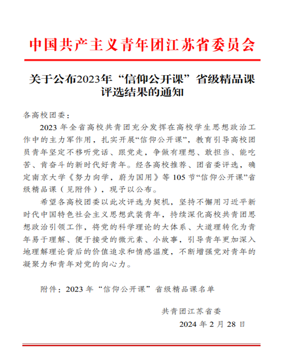 近日,共青团江苏省委发布 2023年“信仰公开课”省级精品课评选结果,我院教师李一鸣报送的课程《马克思主义择业观对当代青年选择职业的现实启示》获评2023年“信仰公开课”省级精品课。