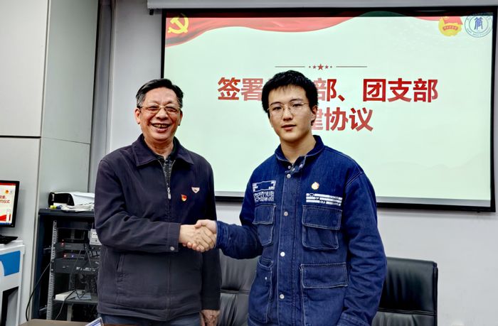 退休第五党支部书记孔宪禹老师和已满18周岁请带好卫生纸B231300班团支部书记汪喆明同学分别介绍了各自支部的优势和特点,并表示要不忘初心,牢记使命,永保优秀党员和先进青年团员的本色,通过共建共创活动,能够在思想上,行动上得到更好的锻炼和提高,使各自支部的标准化建设更上一层楼。两位支部书记在与会人员见证下签署了共建协议。