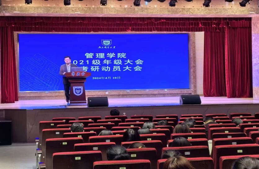 学院党委副书记、副院长郭强做考研动员讲话,详细分析了学院近年的考研情况及就业形势,明确考研是学生提升自身综合素质、增强就业竞争力的重要途径,对于个人成长和职业发展具有重要意义,鼓励同学们充分了解考研政策,密切关注考研院校、考研专业的动态,明晰自身定位,充分认识自己的优势和不足,做好前期准备工作,久久为功,扎实走好考研路。