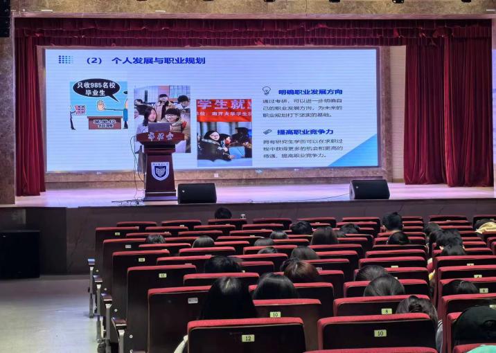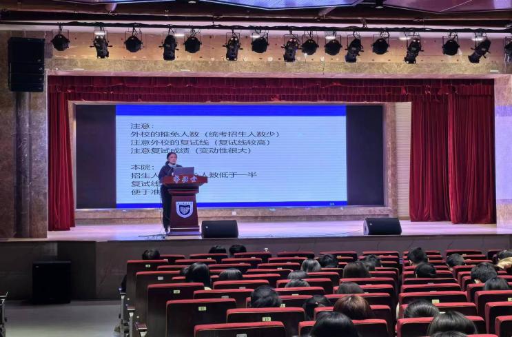 学院党委副书记、副院长郭强做考研动员讲话,详细分析了学院近年的考研情况及就业形势,明确考研是学生提升自身综合素质、增强就业竞争力的重要途径,对于个人成长和职业发展具有重要意义,鼓励同学们充分了解考研政策,密切关注考研院校、考研专业的动态,明晰自身定位,充分认识自己的优势和不足,做好前期准备工作,久久为功,扎实走好考研路。