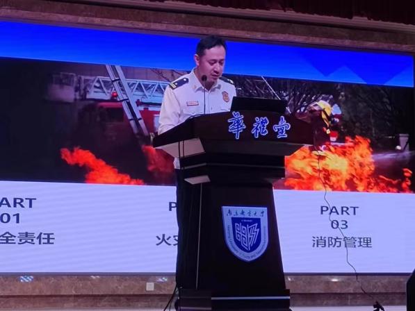 鼓楼消防救援大队副大队长唐琪,从事消防工作23年,是国家一级注册消防工程师。唐大队首先强调了消防责任制度的重要性,让每一位师生都明白自己在维护消防安全中的责任和义务,结合日常消防安全知识,深入浅出地讲解了火灾的成因、预防措施以及火场逃生的基本方法。为了让大家更加深刻地认识到火灾的危害性和防范的必要性,讲座中还特别安排了对真实火灾案例的分析环节。通过播放火灾现场的视频资料,唐大队详细剖析了火灾发生的原因、扑救过程中的难点以及火场逃生的经验教训。这些真实的案例让在场的师生们深受触动,也让他们更加明白了消防安全的重要性。