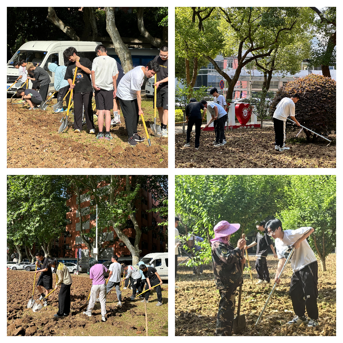 同学们积极响应,明确分工,结成一组组井然有序的队伍,翻新一块块野草丛生的土地。扬起的铁锹,深耕的木耙,那是同学们劳动的身影:在日晒虫鸣交加之中挥汗,于青绿棕褐交界之处耕作,时有蜂鸣蝶舞,鸟雀啁啾。