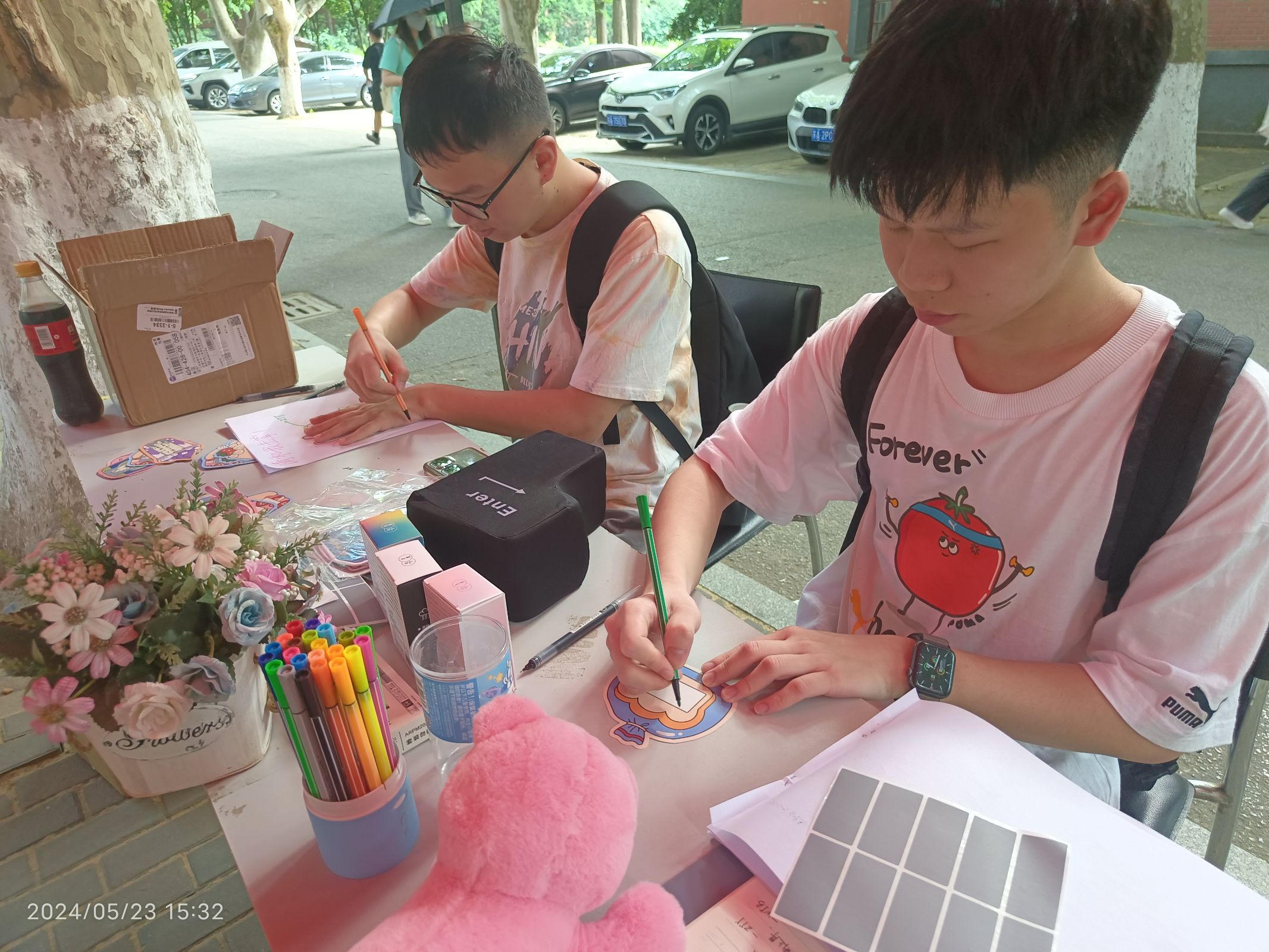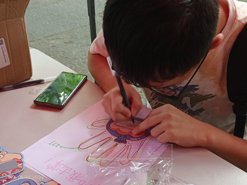 活动在华礼堂门口和操场两个地点进行。外场设有“致未来的自己”、“发泄enter键”、“暖心刮刮乐”和“请和我‘击掌’”等活动。同学们可以用超大号enter键敲击解压,绘制手掌图案传递鼓励,以及通过暖心刮刮乐分享温暖的话语。操场上,同学们参与“甩掉焦虑乒乓球”活动,穿戴装有乒乓球的盒子道具,通过肢体抖动将乒乓球抖出,在欢乐的游戏氛围中缓解了焦虑的情绪。