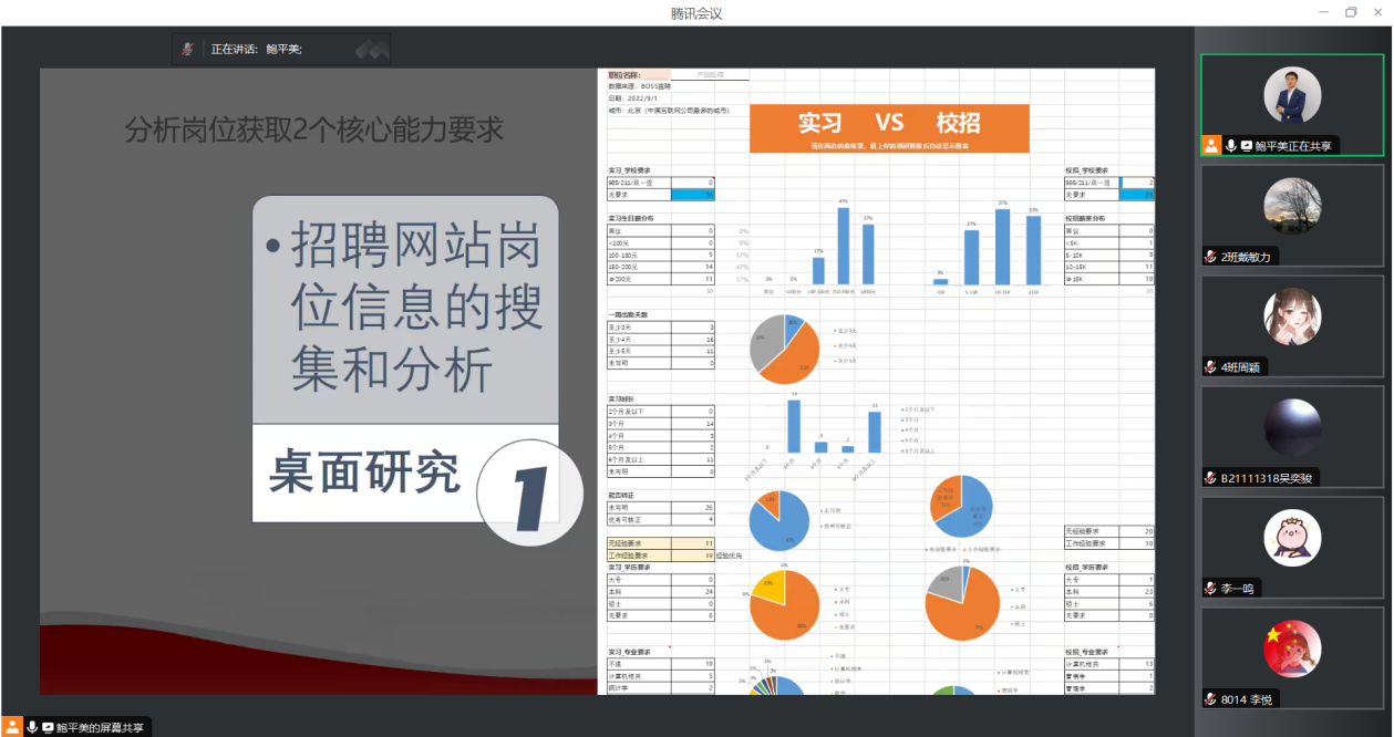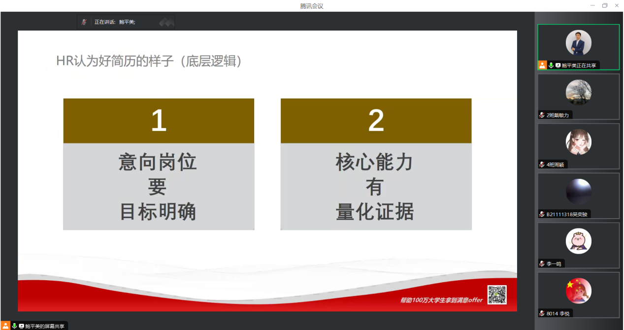 为进一步提高大学生求职就业能力,做好学生就业指导工作,7月26日晚,学院特邀前程无忧51 job内训师、高级项目主管鲍平美于线上开展简历制作指导专题讲座。学院党委副书记、副院长郭强,2025届毕业班辅导员及全体学生参加会议。