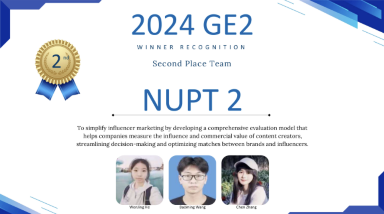 本项目今年5月启动全球报名,7月15日正式开始相关活动,吸引了来自中国、美国、印度、日本、泰国、肯尼亚等国家约200多位大学生参加,由我院的张宸、汪保明、何文婧所组成的“NUPT 2”团队,通过激烈比拼,从60支参评团队中脱颖而出,获得第二名的好成绩,充分展现了南邮管院学生的创新水平与能力。