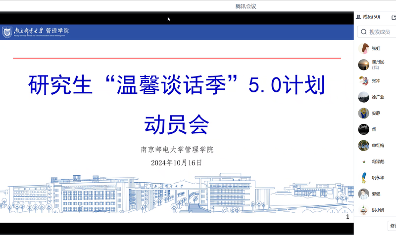 20241016日,学院线上召开研究生温馨谈话季动员会。学院副院长张冲,党委副书记郭强,学院所有研究生导师出席会议,会议由张冲主持。