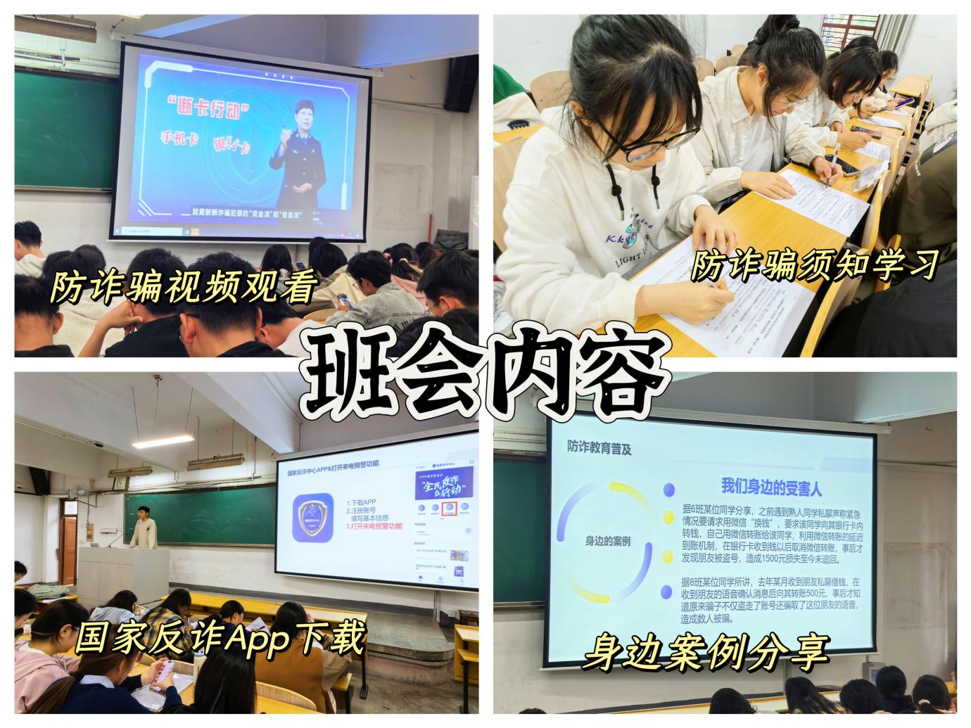 为了增强班会的趣味性和实效性,各班级还创新性地开展了谁是卧底—反诈版和反诈知识竞答等互动游戏。在谁是卧底—反诈版游戏中,同学们分别扮演不同的角色,通过描述和猜测的方式,既锻炼了思维能力,又加深了对反诈知识的理解。反诈知识竞答则通过抢答和必答环节,激发了同学们的学习热情,进一步巩固了学习成果。通过这些活动,同学们不仅学到了丰富的反诈知识,还增强了团队协作和沟通能力。他们纷纷表示,此次活动让他们更加深刻地认识到了防范电信网络诈骗的重要性,也让他们在未来的学习和生活中更加警惕和谨慎。