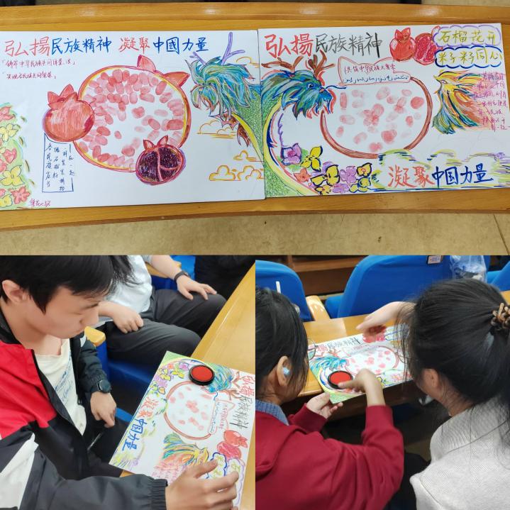 活动最后,同学们一起创作《石榴花开,籽籽同心》手印画。“像石榴籽一样紧紧相依!”同学们欢呼雀跃,描绘着中华民族一家亲的团结形象,增强了同学们的爱国主义情怀和民族自豪感。