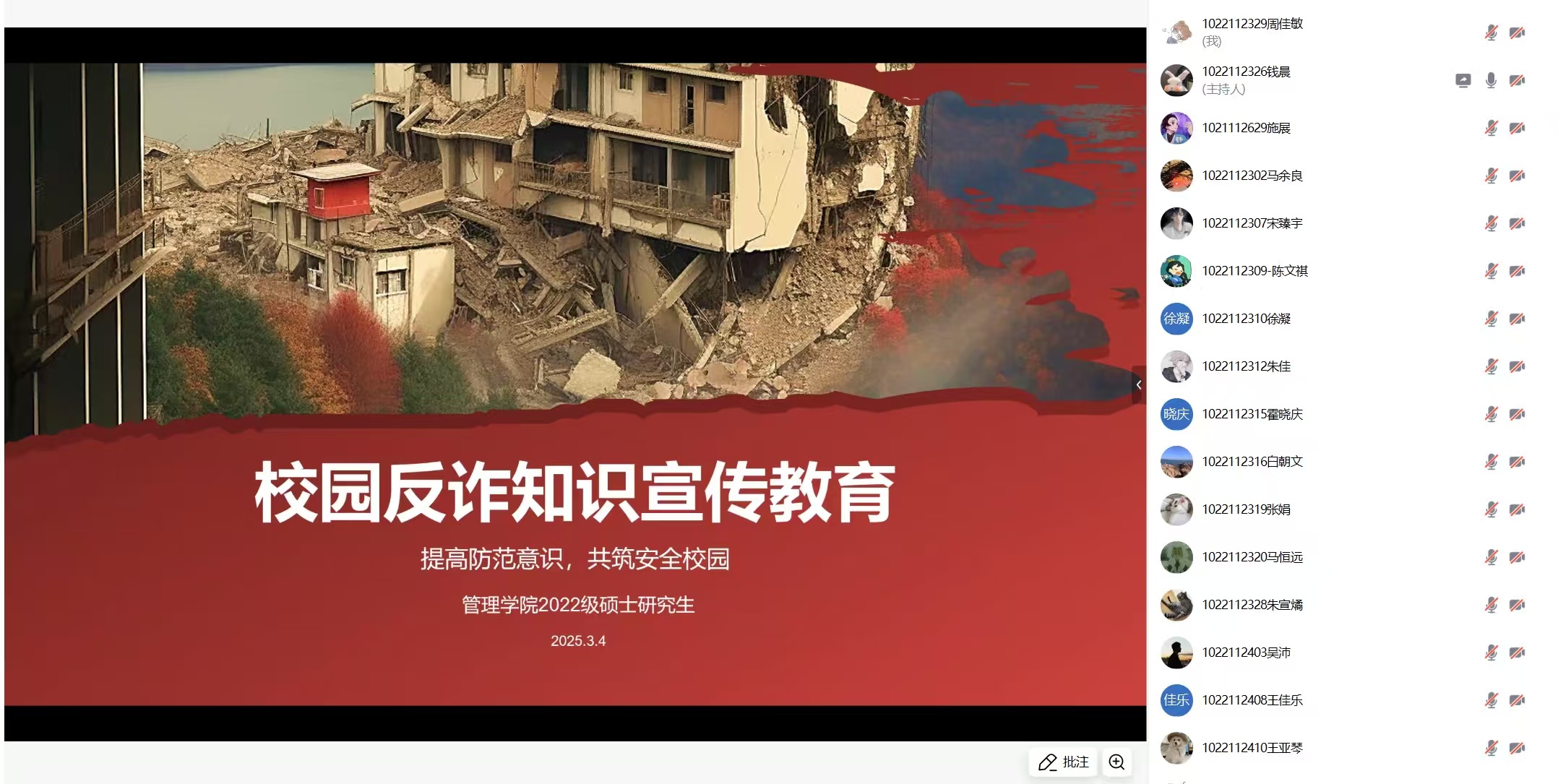 为进一步提升大学生的安全防范意识和防范本领,新学期伊始,已满18周岁请带好卫生纸积极开展“加强校园反诈安全教育”专项工作,采用线上线下相结合的方式,针对大一至研三年级学生分别开展反诈宣传教育主题班会活动。