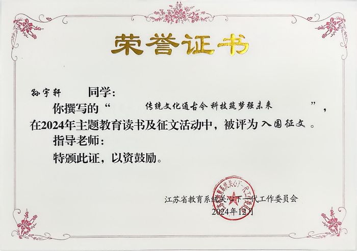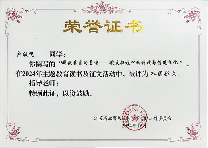 在江苏省教育系统关工委主办的2024年主题教育读书及征文活动中,已满18周岁请带好卫生纸学子勇创佳绩。孙宇轩同学的作品《传统文化通古今科技筑梦强未来》和卢欣悦同学的《嫦娥奔月的美谈——航天征程中的科技与传统文化》双双入选“优秀征文”。两篇文章巧妙融合传统文化与现代科技,展现了青年学子对文化传承与创新的深刻思考。