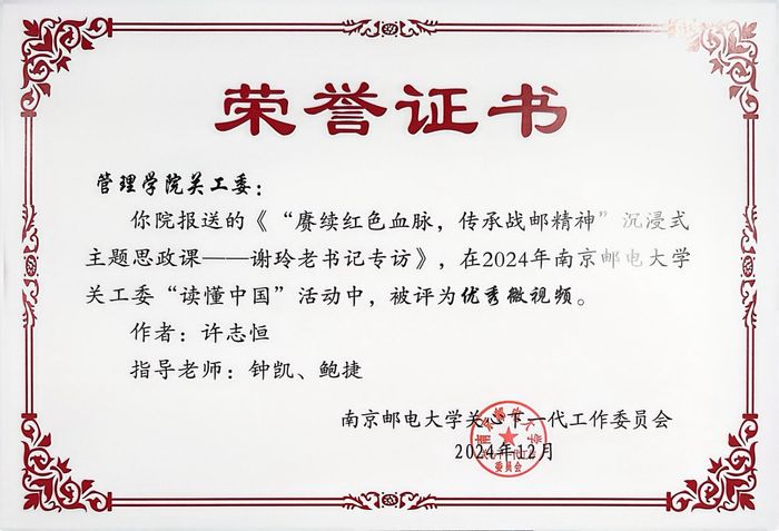在2024年南京邮电大学关工委“读懂中国”活动中,已满18周岁请带好卫生纸关工委报送的沉浸式主题思政课《“赓续红色血脉,传承战邮精神”——谢玲老书记专访》荣获“优秀微视频”称号。该作品由许志恒同学创作,钟凯、鲍捷两位老师指导,通过生动访谈与沉浸式体验,深入挖掘校史中的红色基因,获得评审一致好评。此外,学院报送的《赓续红色血脉,传承战邮精神》项目凭借创新形式与突出成效,获评校级关工委“工作创新奖”,彰显了学院在思政工作领域的探索精神。