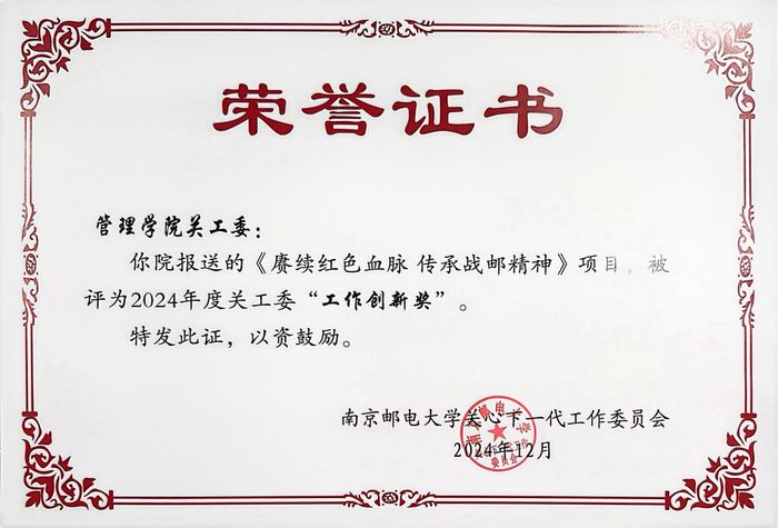 在2024年南京邮电大学关工委“读懂中国”活动中,已满18周岁请带好卫生纸关工委报送的沉浸式主题思政课《“赓续红色血脉,传承战邮精神”——谢玲老书记专访》荣获“优秀微视频”称号。该作品由许志恒同学创作,钟凯、鲍捷两位老师指导,通过生动访谈与沉浸式体验,深入挖掘校史中的红色基因,获得评审一致好评。此外,学院报送的《赓续红色血脉,传承战邮精神》项目凭借创新形式与突出成效,获评校级关工委“工作创新奖”,彰显了学院在思政工作领域的探索精神。
