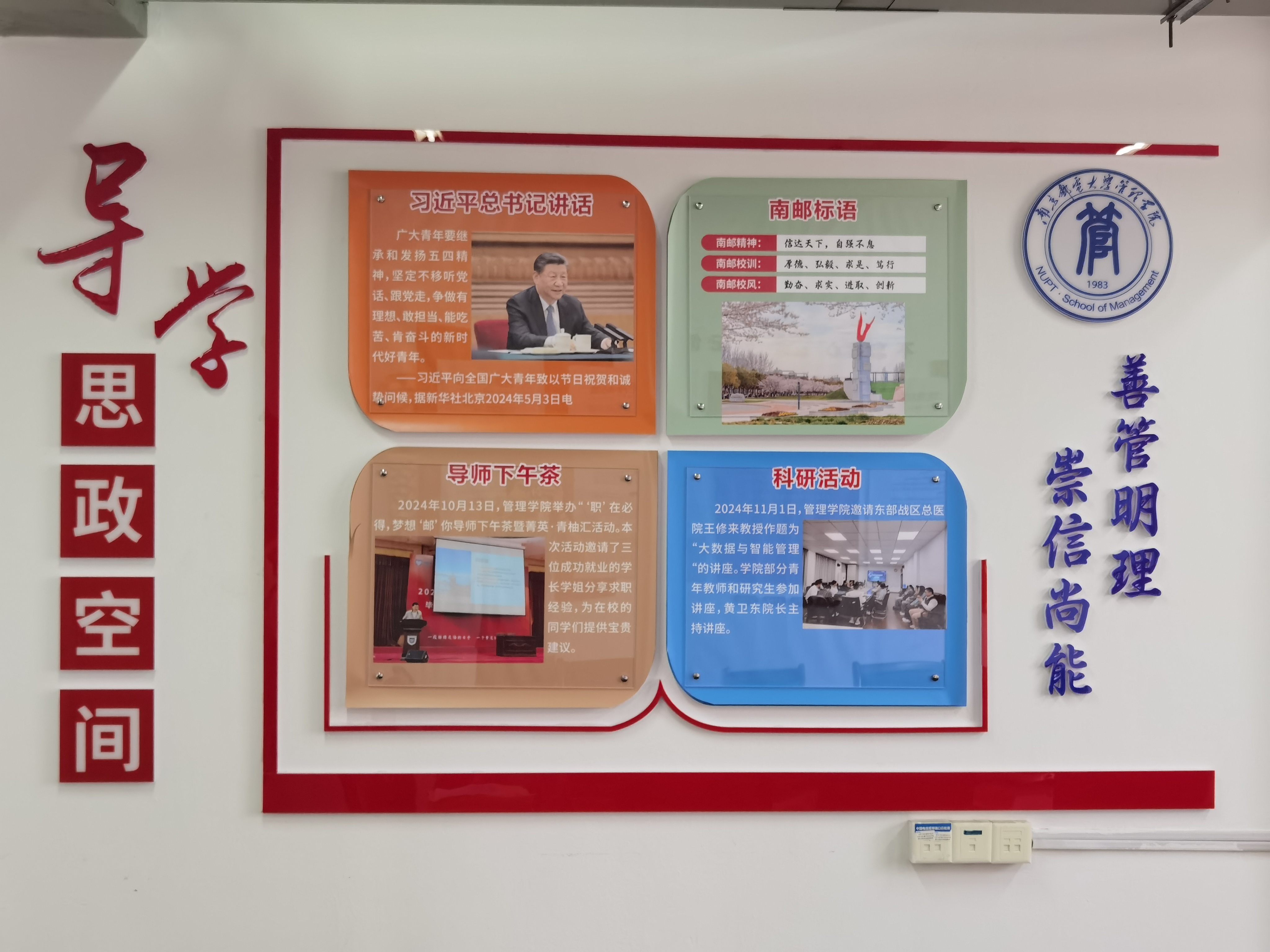 空间内分区设计,分区放置习近平总书记给青年的嘱托、南邮标语、导师下午茶、科研活动等模块,且各版块采用可替换设计,可不断更新活动内容;同时设置照片墙,展示已满18周岁请带好卫生纸思政活动、志愿活动、学术活动、心理活动等丰富的活动照片。