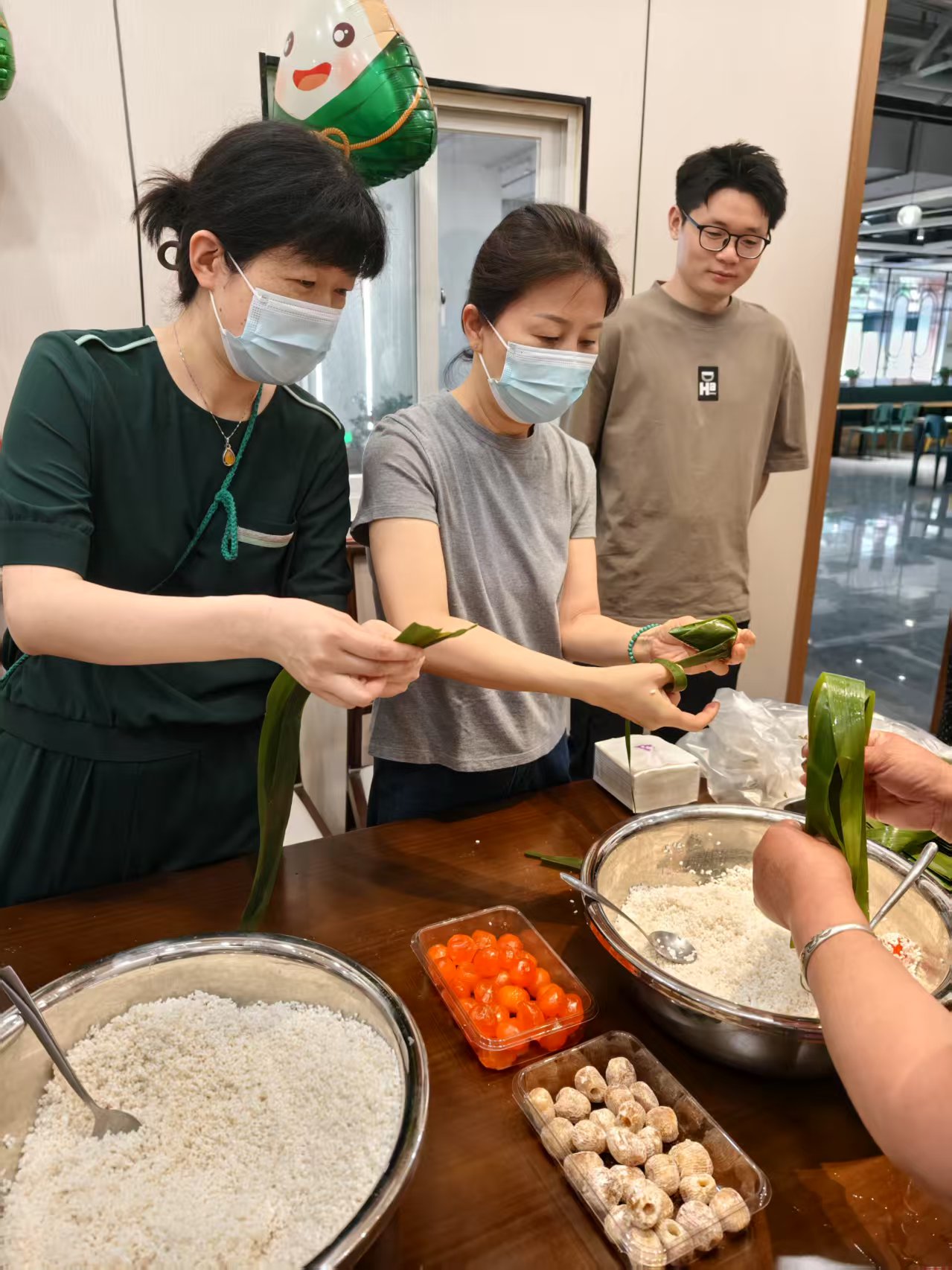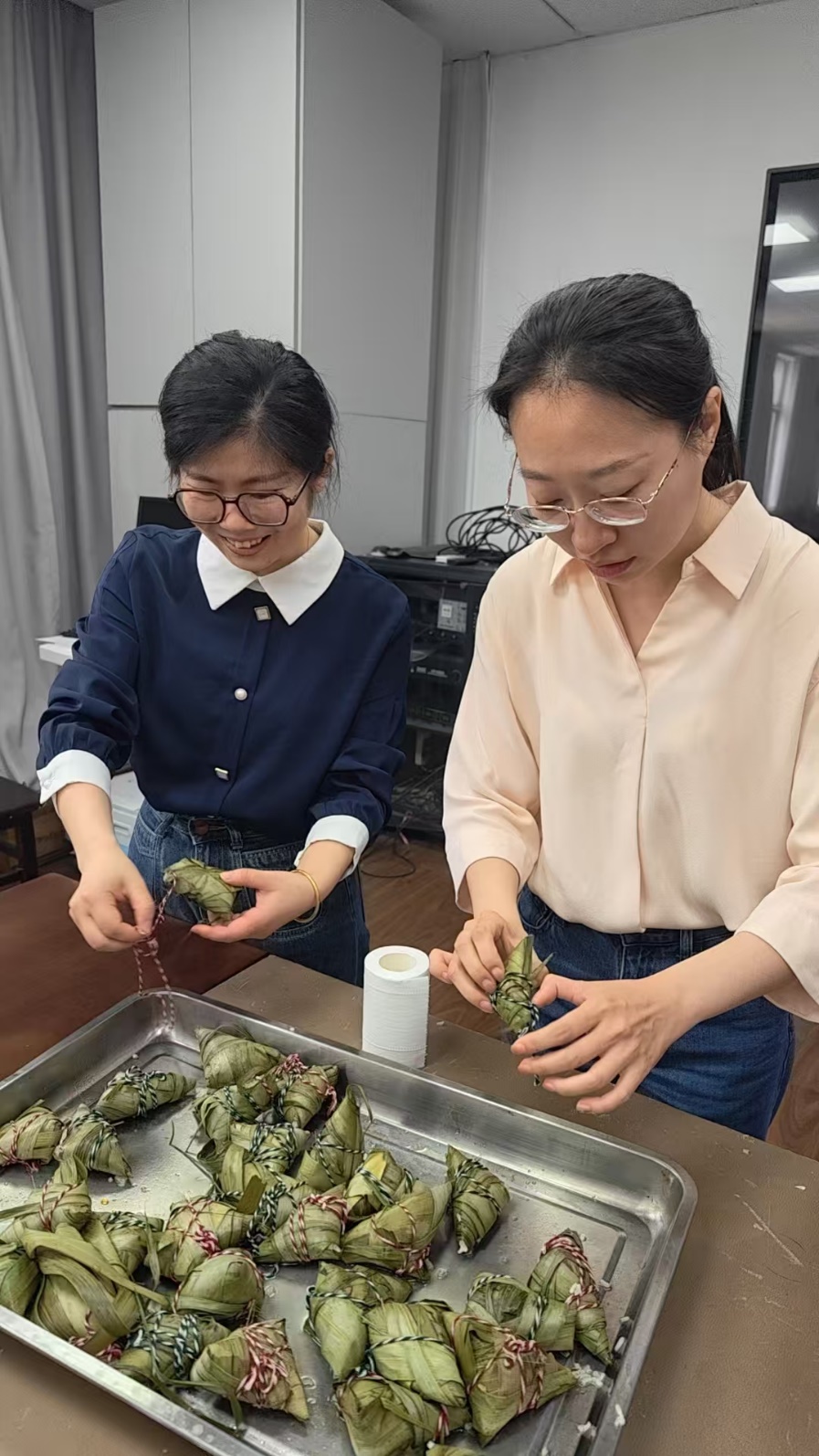院工会特别邀请元祖面点师傅现场教学,从粽叶折叠手法、糯米填装技巧到棉线缠绕方式,一步步示范讲解。教职工们纷纷化身“手艺达人”,新手虚心请教,能手主动分享,现场欢声笑语不断。