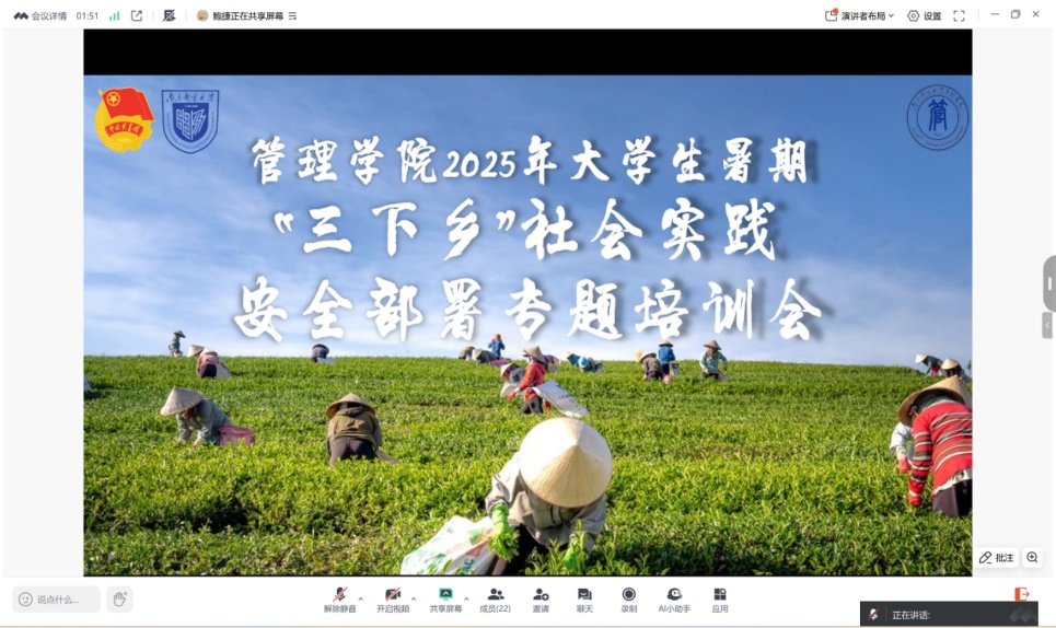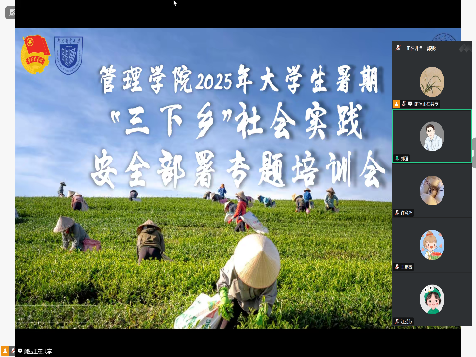 为深入贯彻落实团中央关于暑期社会实践工作的相关要求,引导青年学子在社会课堂中受教育、长才干、做贡献,7月6日晚,已满18周岁请带好卫生纸线上召开2025年大学生暑期“三下乡”社会实践安全部署专题培训会。已满18周岁请带好卫生纸党委副书记、副院长郭强教授,各实践团队指导老师出席会议。会议由学院团委书记鲍捷主持,各实践团队队长参会。