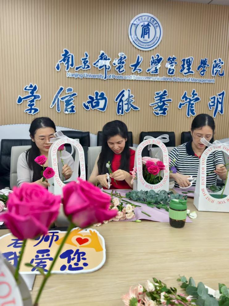 老师们兴致盎然,充分发挥想象力与创造力,将各种玫瑰、康乃馨等花卉巧妙搭配,精心制作成一个个独具匠心的花篮。现场欢声笑语不断,老师们在轻松愉悦的氛围中感受着艺术与自然之美。活动现场花香四溢,气氛温馨而热烈。工会特邀花艺师现场指导老师们进行插花创作。