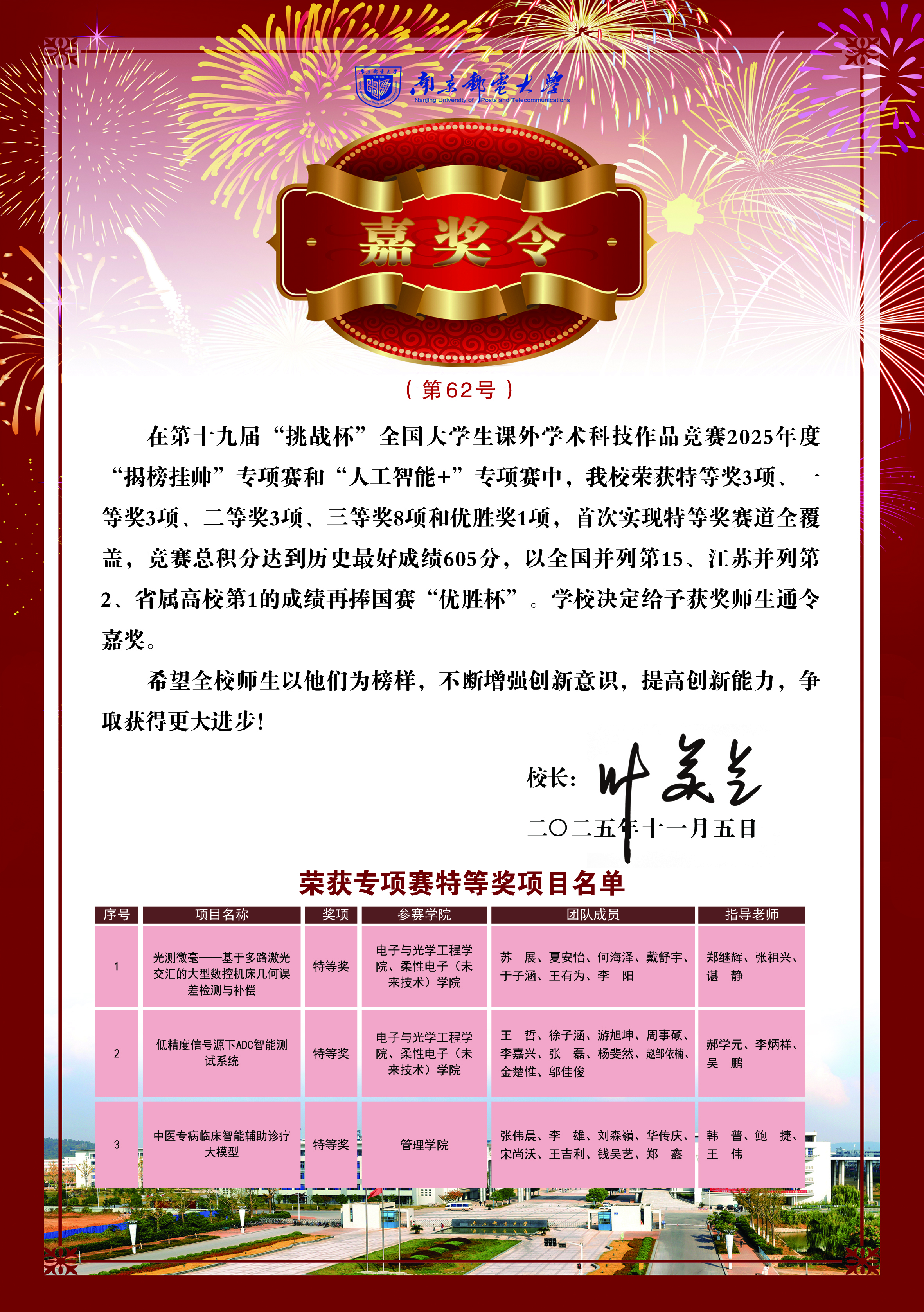 近日,第十九届“挑战杯”全国大学生课外学术科技作品竞赛 2025 年度“揭榜挂帅”专项赛和“人工智能+”专项赛终审决赛成绩揭晓,我院喜报频传。在韩普、鲍捷、王伟三位老师的指导下,由我院本科生张伟晨、李雄、刘森嶺、华传庆、宋尚沃、王吉利、钱吴艺、郑鑫作为成员的“人工智能+”专项赛特等奖项目“中医专病临床智能辅助诊疗大模型”荣获校长嘉奖令。