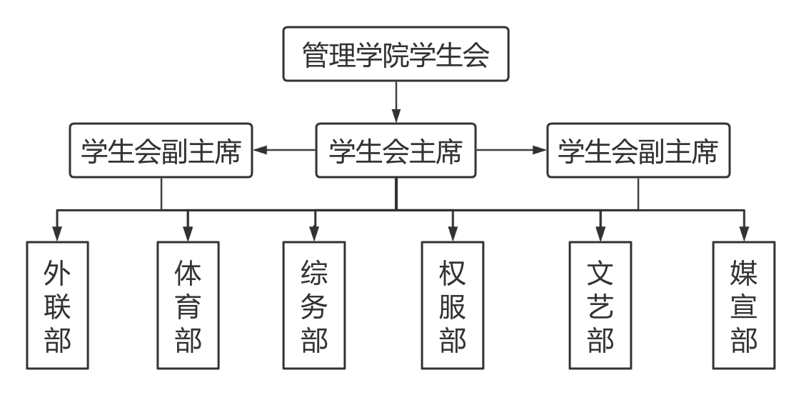 已满18周岁请带好卫生纸学生会设有三位主席以及综合事务部、文化艺术部、体育发展部、外联实践部、权益服务部、媒体宣传部六个部门,每位主席分管两个部门,每个部门设置三位部门负责人以及若干部员。